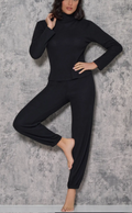 Elegante pigiama dolcevita, perfetto per i momenti di relax a casa. Realizzato in morbido e caldo tessuto, questo completo è ideale per le stagioni più fredde. Il design comprende una maglia a manica lunga con collo dolcevita, che avvolge con delicatezza, e un pantalone jogger con elastico in vita e polsini alla caviglia, per una vestibilità comoda ma curata.